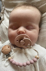 Suttekæden er produceret af 100% fødevaregodkendte silikoneperler og håndpolerede bøgetræsperler, som sammen giver et unikt design. Passer perfekt til barnets outfit og holder sutten nemt på plads.