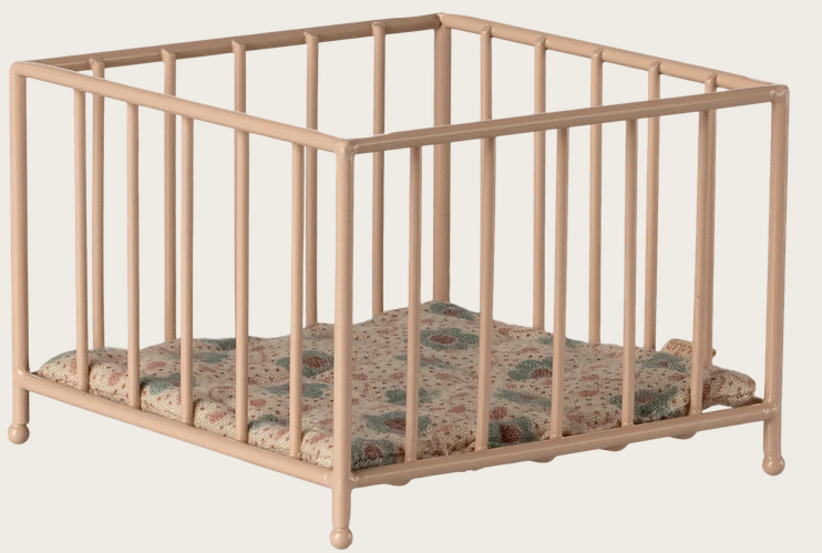 Lad babyen lege sikkert i en sød kravlegård. Denne passer perfekt til kaniner og harer i størrelse My. Kravlegården er i metal og malet i en dejlig lyserød farve. I bunden er en blød madras betrukket med unikt Maileg stof.