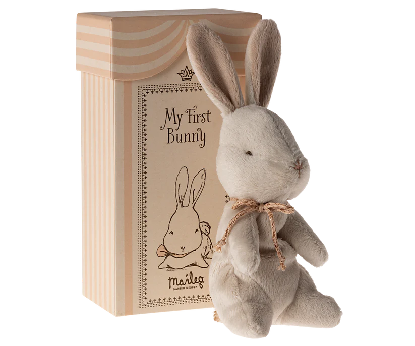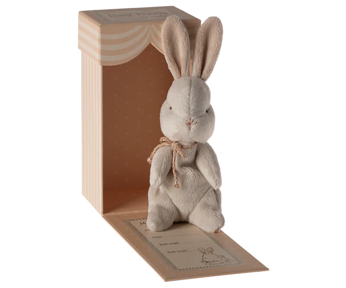 Min første kanin er perfekt til små hænder. Den er lavet i en blød plys kvalitet og har et farvet bånd rundt om halsen. Den er pakket i en smuk gaveæske, hvor du kan tilføje fødselsoplysningerne indeni. Dette er den perfekte baby shower gave.