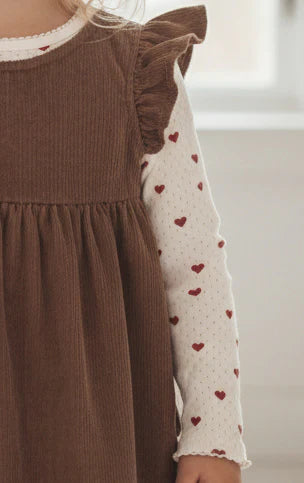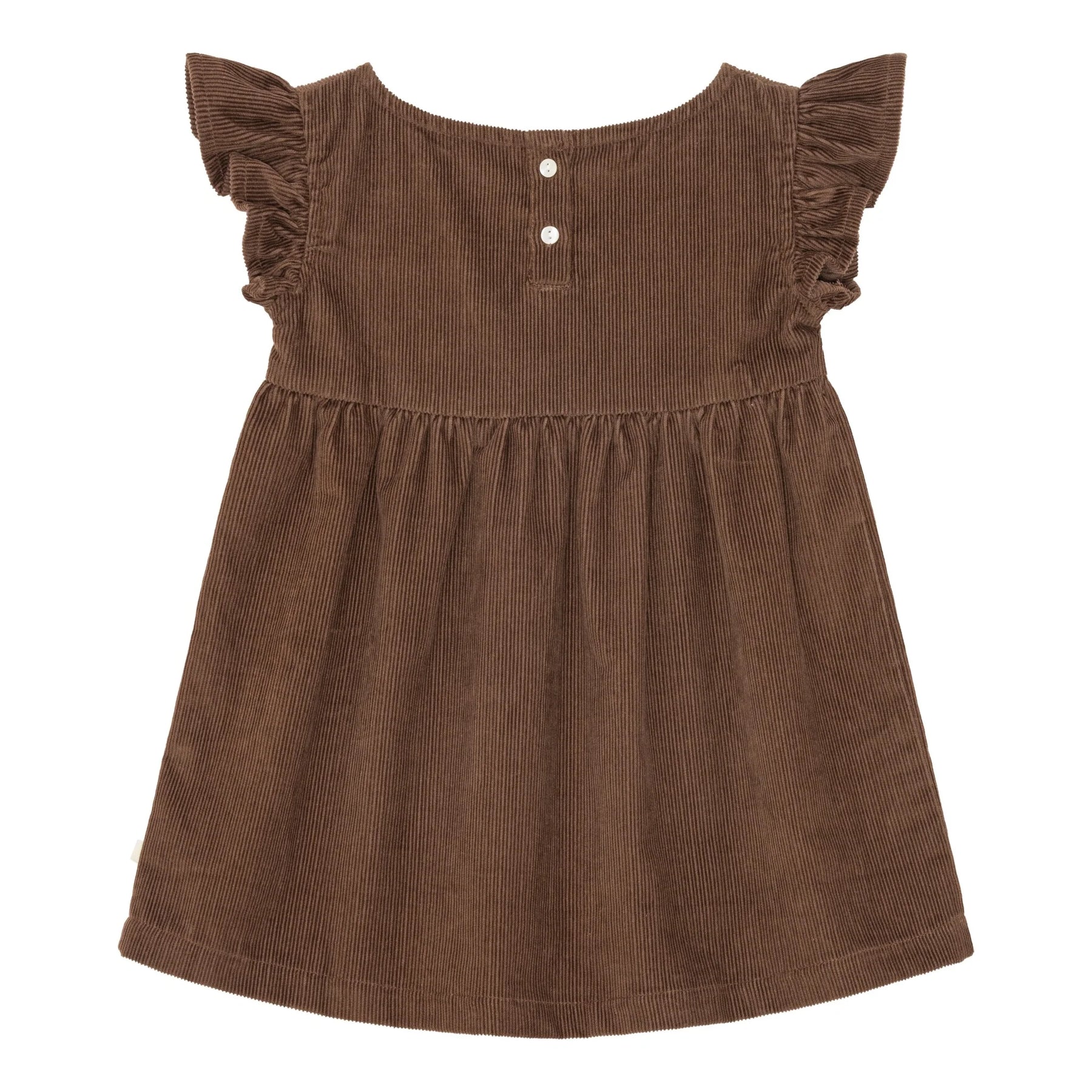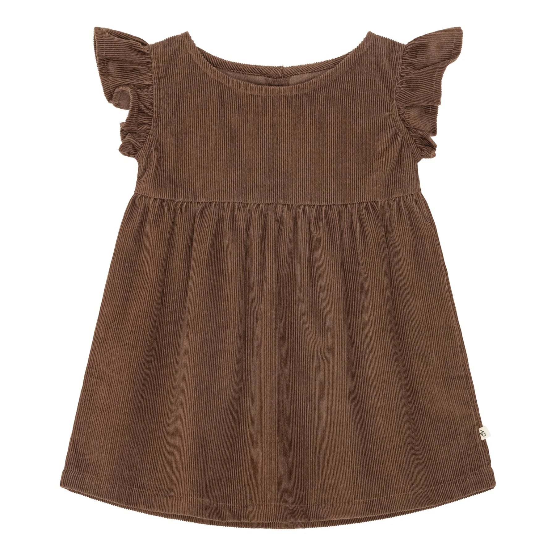 brun fløjlskjole med flæse på skuldrene, vævet i en blød, økologisk bomuldskvalitet.
