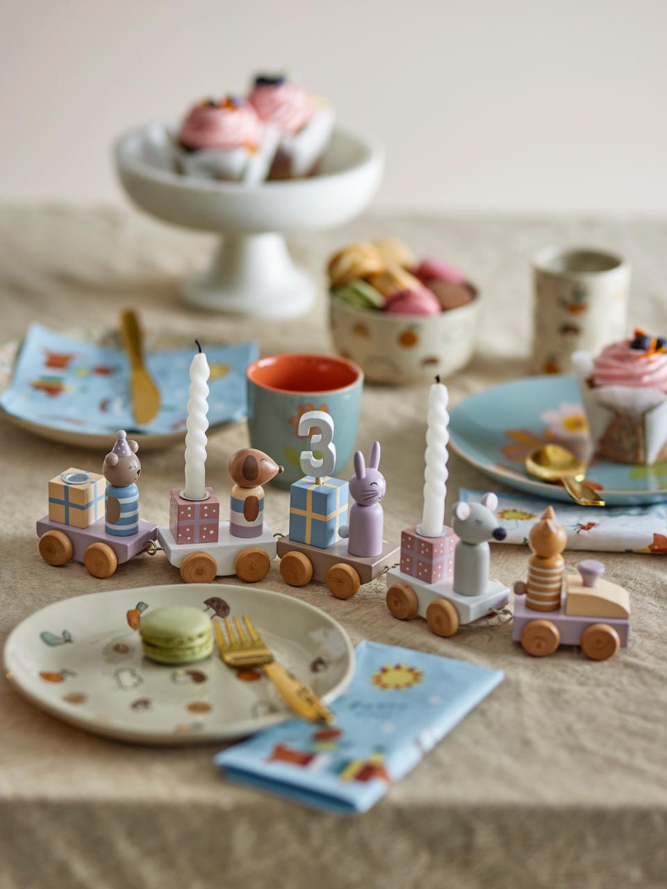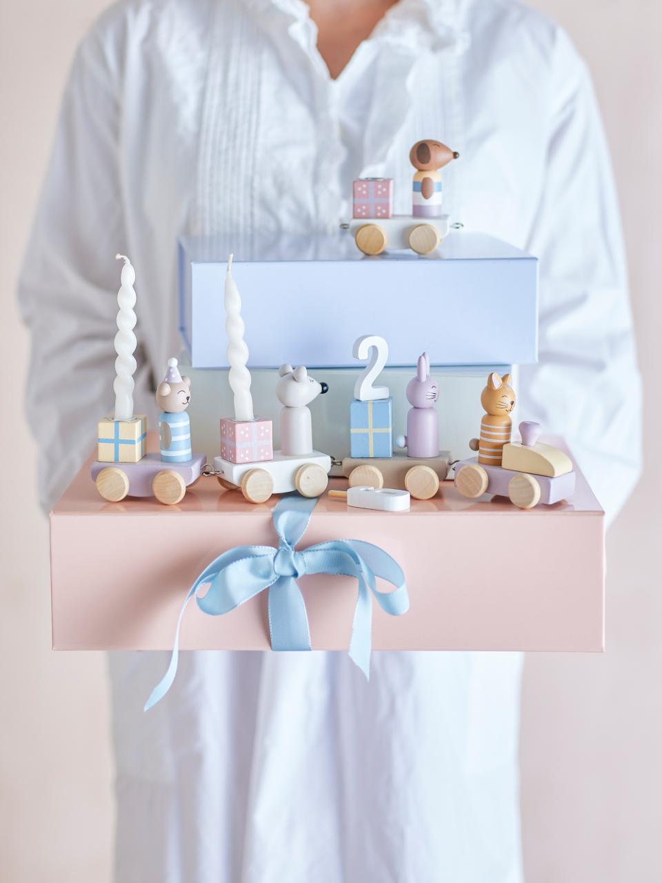Gør fødselsdagsfejringen ekstra speciel med Junaid Fødselsdagsdekorationen fra Bloomingville MINI. Det festlige tog består af fem vogne med flotte gaver og søde dyr i fine pastelfarver. Det hyggelige tog kommer med tal fra 0-9, har plads til tre lys og kan bruges som dekoration på børneværelset året rundt. Sættet leveres i en sød gaveæske og er den perfekte barsels- eller dåbsgave.