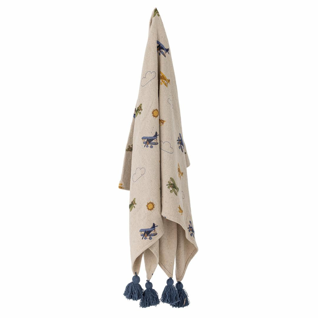 Plane Plaiden fra Bloomingville MINI er lavet i genanvendt bomuld, og med sine fine detaljer, kan det sprede glæde og sjov på børneværelset. Tæppet er dekoreret med søde motiver af flyvemaskiner og skyer og i hvert hjørne sidder blå kvaster. Brug tæppet til at skabe en hyggelig og varm atmosfære, eller læg det på gulvet, når de små leger.