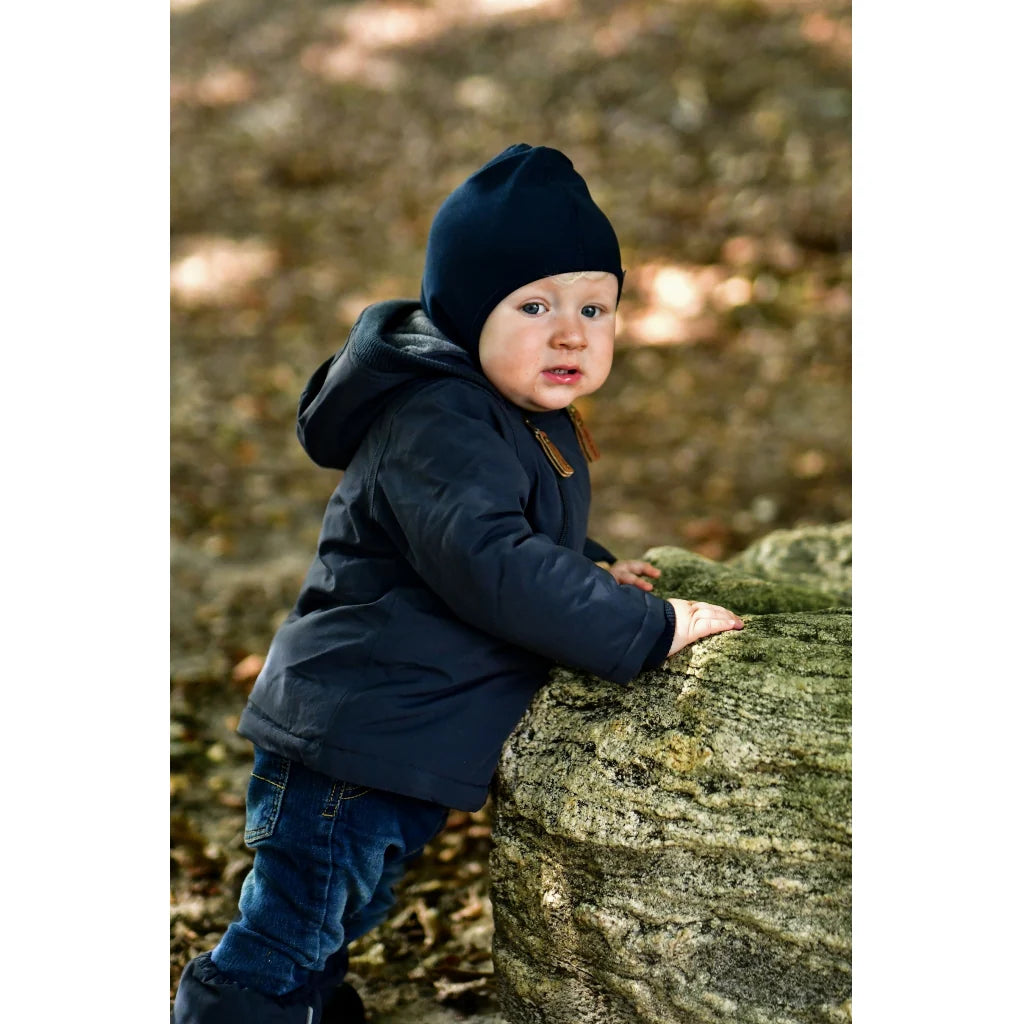 Ensfarvet mikk-line elefanthue i dobbelt lag og med vindstopper-membran, der blokerer for den kolde vind. Elefanthuen er lavet af bomuld på indersiden og en blanding af merinould og akryl på ydersiden. Bomulden er skånsom mod barnets hud og behagelig hele dagen. Merinoulden sikrer at barnets hoved holdes lunt uden at føles ophedet, og akrylfibrene gør huen ekstra slidstærk og bidrager til at bevare huens pasform. Huen er OEKO-TEX® Standard 100 certificeret, hvilket garanterer, at den er fri for sundhedsskadelige kemikalier. Denne lækre vinterhue dækker det meste af barnets hoved, hals og ansigt, så den beskytter barnet mod kulde og vind, når det leger og udforsker naturen under den åbne himmel.