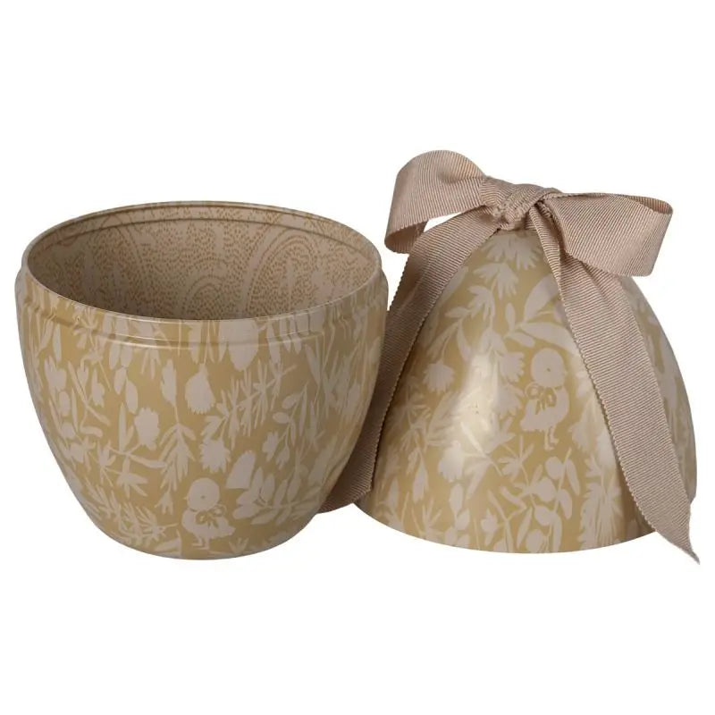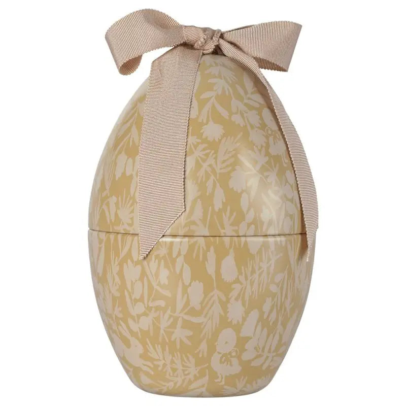 Flot metal påskeæg i en gul farve fra Maileg. Påskeægget er gult og er dekoreret med fine hvide silhuetter af blomster og dyr.