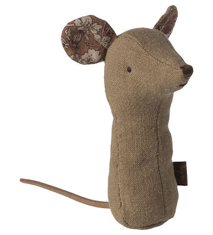 Sjov Maileg rangle i hør formet som en mus i brun med store ører i rosa med blomsterprint og en lang hale i læder.